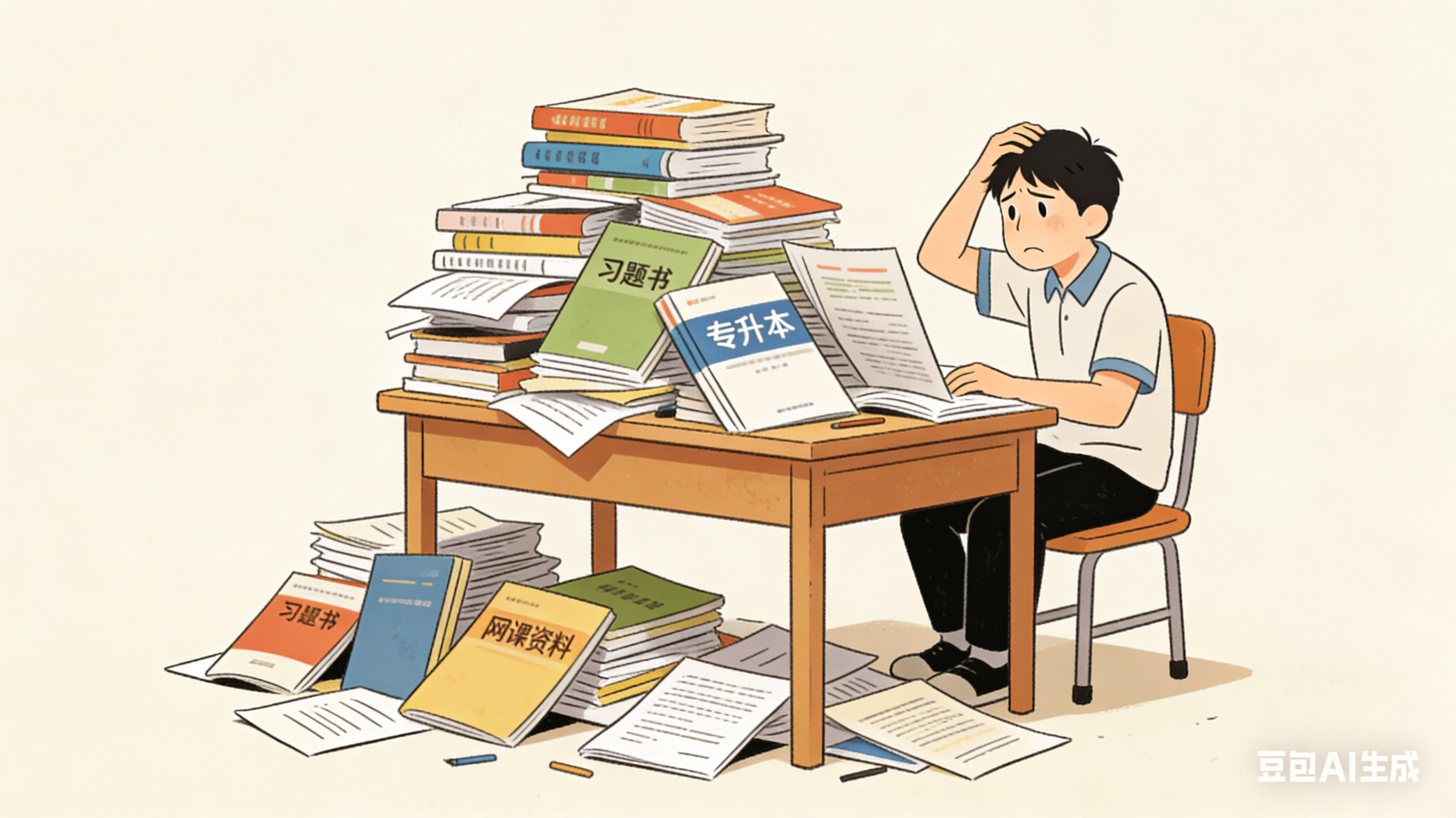 这是专升本考生最常见的误区之一。很多同学刚决定专升本,就开始疯狂搜集各种资料:教材、习题册、网课、笔记……不管是不是适合自己,先囤了再说。结果资料堆了一桌子,却不知道该从哪开始学。
